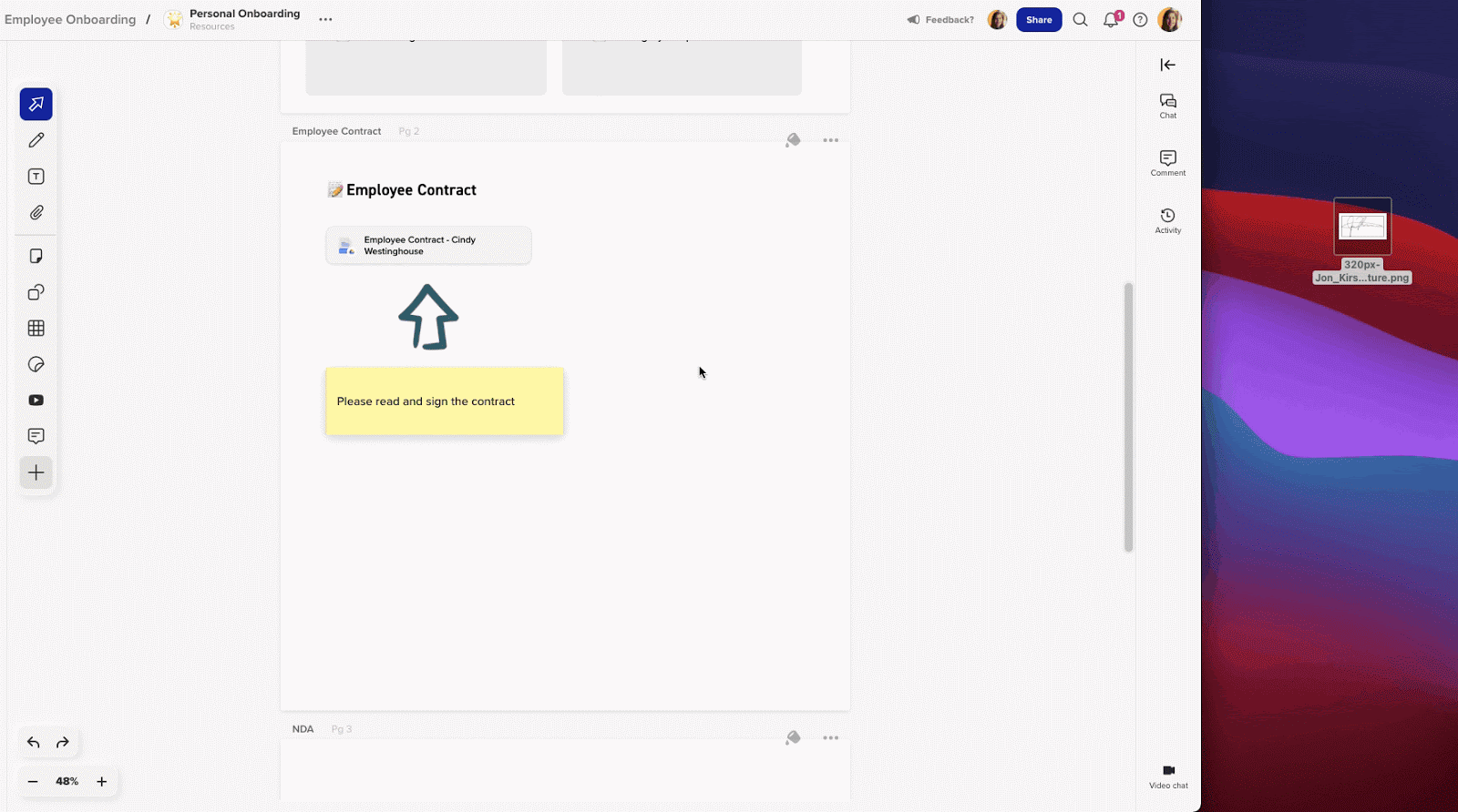 Once you have your master template constructed, you can create a new canvas from that template for each new employee. Once you’ve shared the canvas with them, your new employees can begin the process of filling out all the forms. Google Docs seamlessly syncs with the canvas, so employees can view, modify, and sign directly in the shared document.