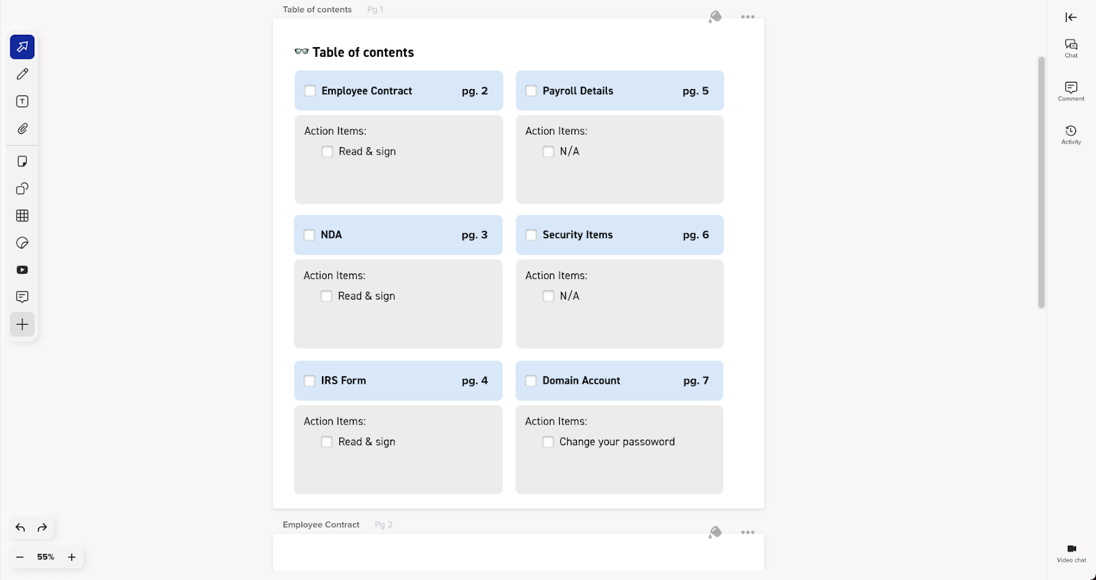 After creating a new project, you can use each page for specific documents and action items. The first page should be an overview and table of contents so new team members can check-off the completed items as they fill them out. Each page after that will represent one section with all of the related materials attached. These sections can be any onboarding paperwork you need from the new employee such as their contact information, IRS and payroll information, and confirmation they’ve read and understand the employee code of conduct.