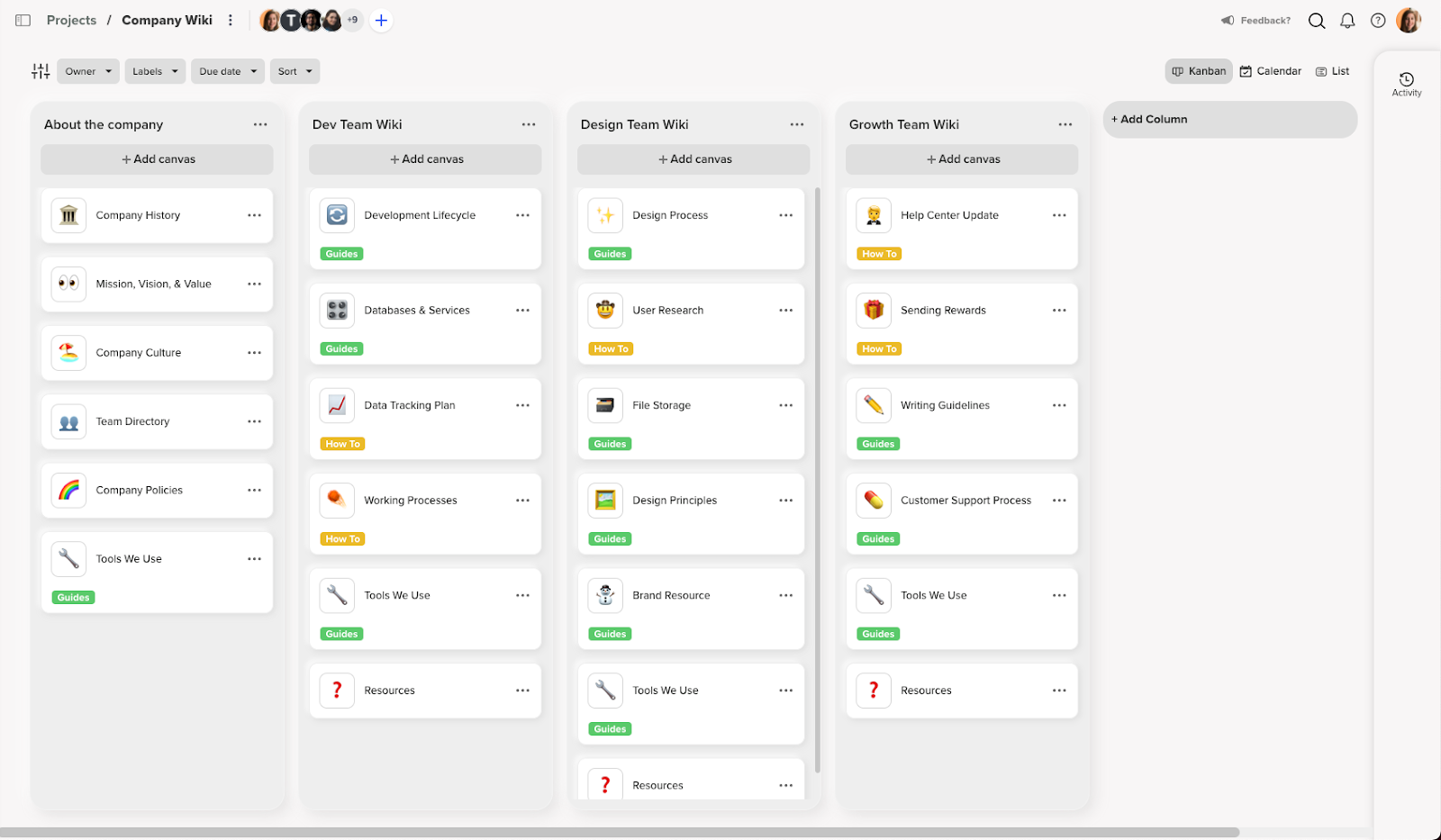 You can create a group Kanban project that details your structure of the company. Each column should represent a different part of the company with all relevant information added to the canvases. Use only one canvas per topic, so the information is easily digestible and remains organized. Having a canvas for other team members’ contact information and what projects they head can also be a useful canvas for new team members. A “tools we use” canvas can easily explain what tools the team uses with documents, screenshots, or videos explaining how to use them. Your team members can quickly refer to this canvas as needed.