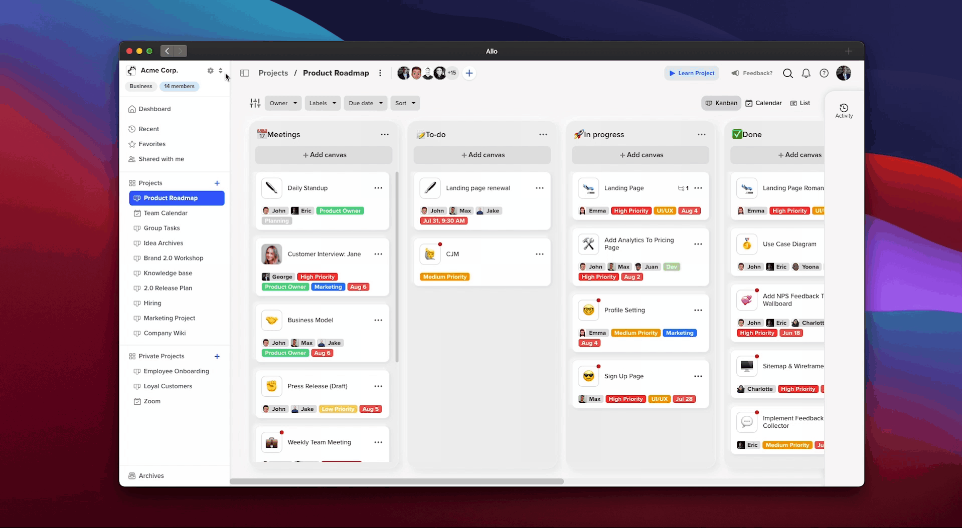 Allo is a collaboration, documentation, and communication platform designed to tackle the drawbacks of pre-existing platforms like Confluence, Trello, and Asana. It’s a visual platform that’s perfect for beginners.