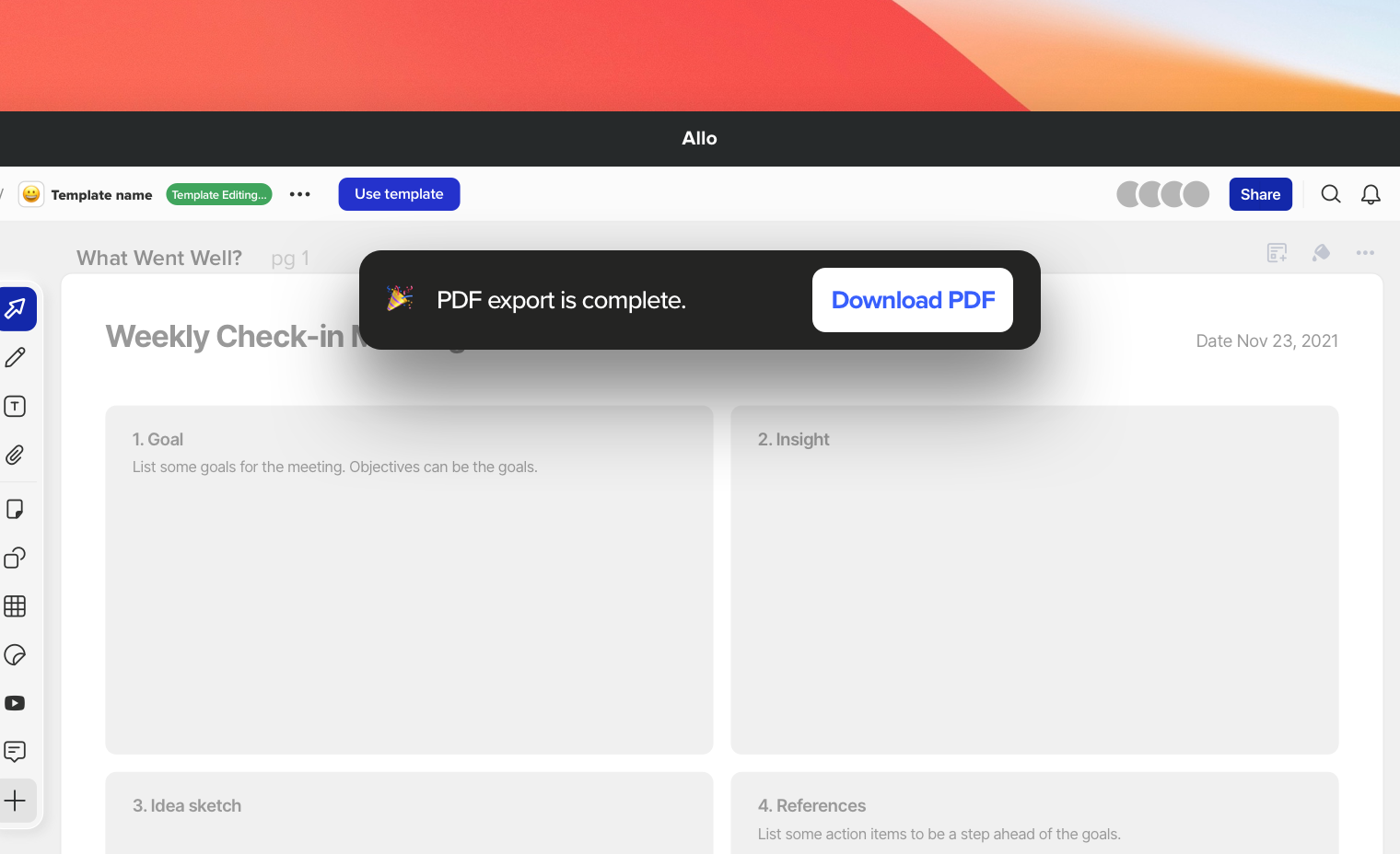 Did you know you can share your ALLO canvas as a PDF? Simply click on the three dots next to your canvas’ name and click on the words “Export to PDF” and your Canvas will save to your device.