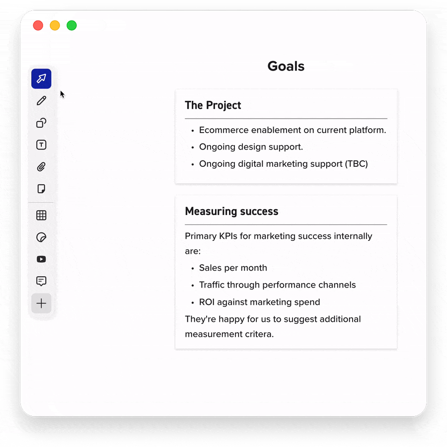 Highlighting on the fly, which has been requested by some of our workshop facilitators is finally here! Now users are able to use the drawing tool to highlight anything, not just text. Select your line thickness and color in the vertical toolbar and visually note anything of importance to all canvas collaborators in real-time or asynchronously. Our highlighter paired with our improved eraser which now includes a disappearing trail, will make pointing out objects seamless.