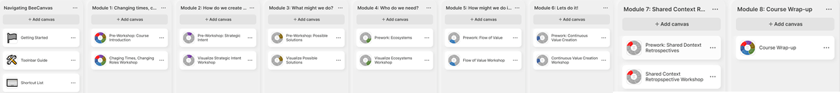 Larry starts by first creating a project for the course. Each module in the course corresponds to a Kanban column for each of the Plays in Lean-Agile Strategy, along with a Course Introduction and Course Wrap-up, for a total of eight columns. Under each column are the unique canvases for each workshop in that module.