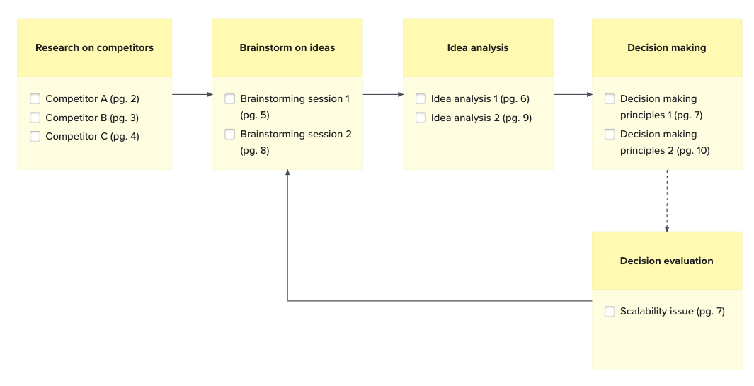 Similar to how we often provide an abstract or summary when writing text-based documentation, we should also create an overview at the beginning of our visual documents before digging into the details. For example, when presenting a process or summary, we can use diagrams and flowcharts like below. This helps the reader understand the overall steps that were taken during the process intuitively.