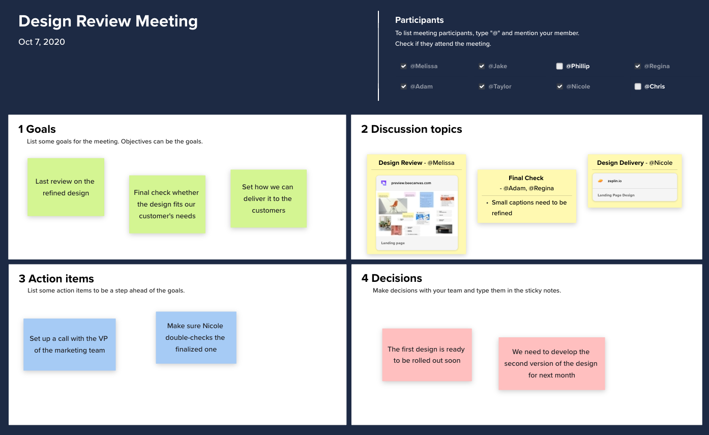 Let's take a simple example - meeting notes. Traditionally, meeting notes are filled with lines of texts, with external links attached when any outside reference is needed. Imagine how we can do this differently with visuals. Below is an example of the notes taken during a meeting. It contains the standard information we have for meeting notes plus some external reference links, but there are no bullet points or long lines of texts. Instead, we use post-it notes grouped into each section and embedded documents and designs to create logical groupings while not boring for the reader.