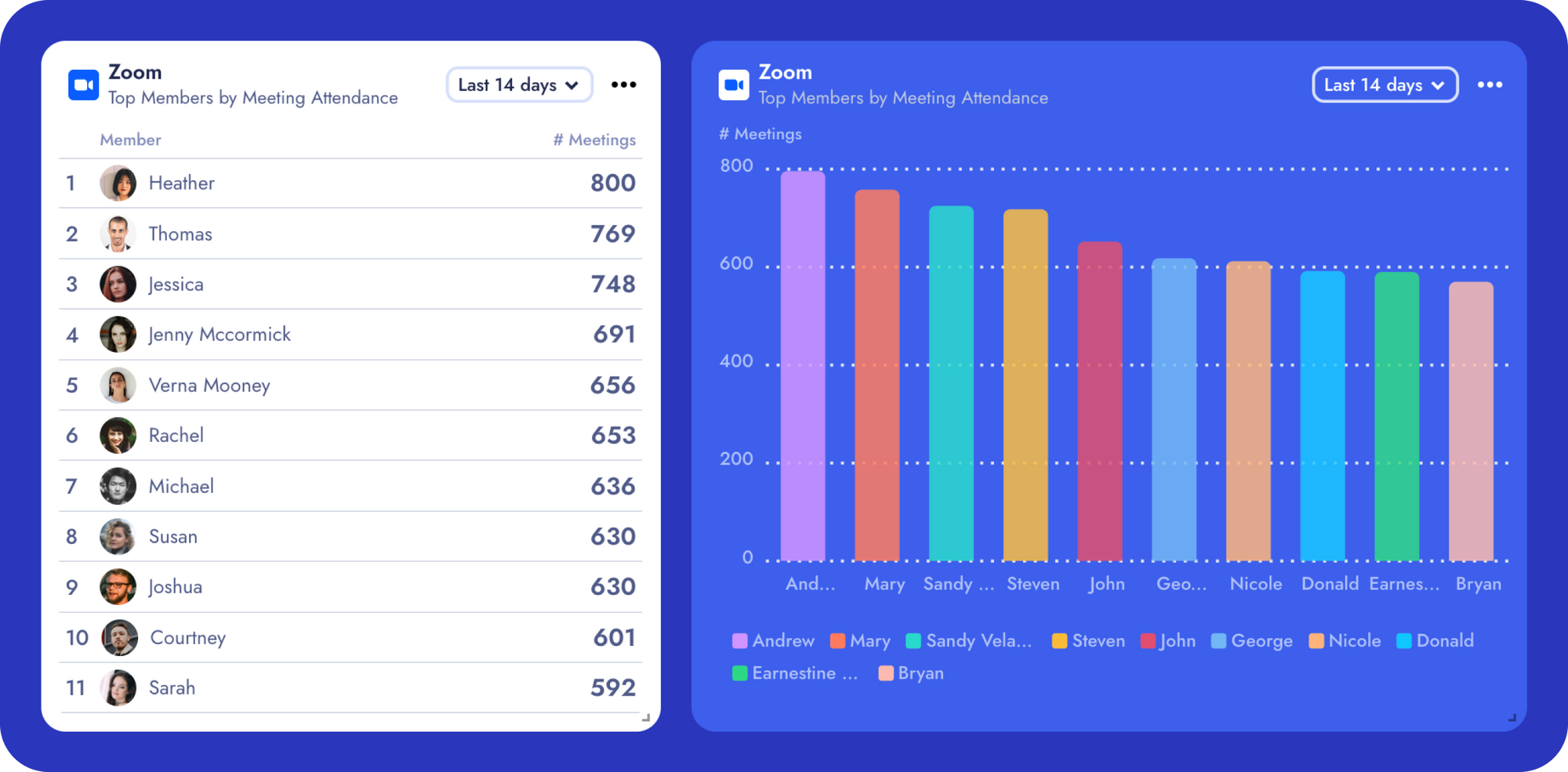 Monitoring meeting frequency can provide insights into how communication within teams unfolds. An upward trend in the number of meetings could signal increased collaboration needs or challenges visible in other platforms like Slack, Jira, or Asana. Identifying who is most frequently engaged in meetings can help ensure a balance between essential communication and productivity, preventing the potential for "Zoom fatigue".