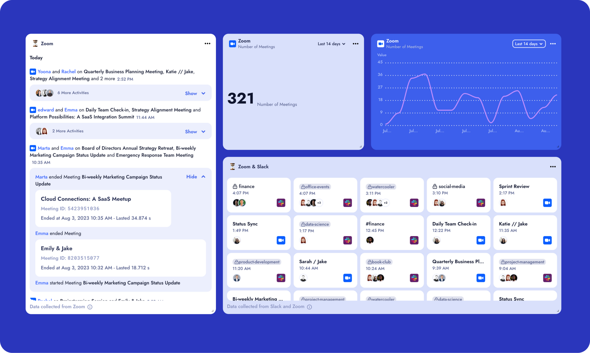 In addition to the quantitative insights provided by our metrics and dashboards, another feature that deserves your attention is the Activity Feed. When integrated with Zoom, this live stream showcases the meetings taking place across your team or organization.
