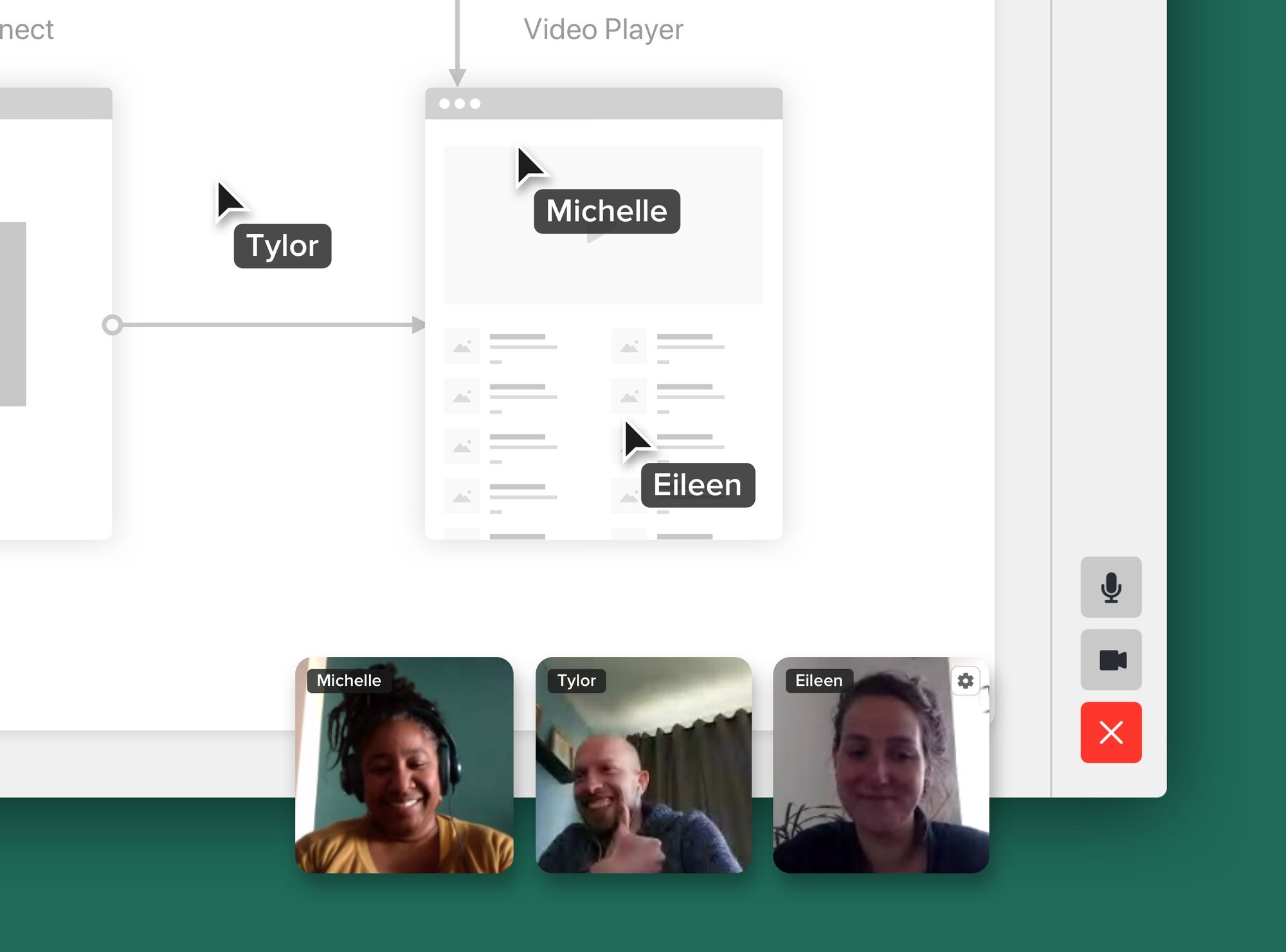 When the designs and user flows are ready, Eileen asks all the team members to get on the canvas and start a quick video call. Everyone can easily follow with Eileen's real-time cursor when she is going through the whole design.