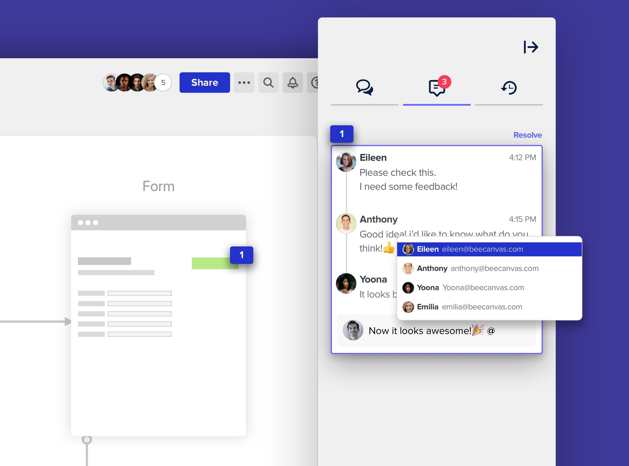 Being able to reference a specific point of the design is crucial when trying to provide design feedback. With the comment feature on Allo, this can easily be done. For instance, when James has a concern regarding the UI of a button, he can simply drop a comment on top of that exact button to voice her concern. He can also tag the teammates that might be related to this issue, so no one will miss the feedback.