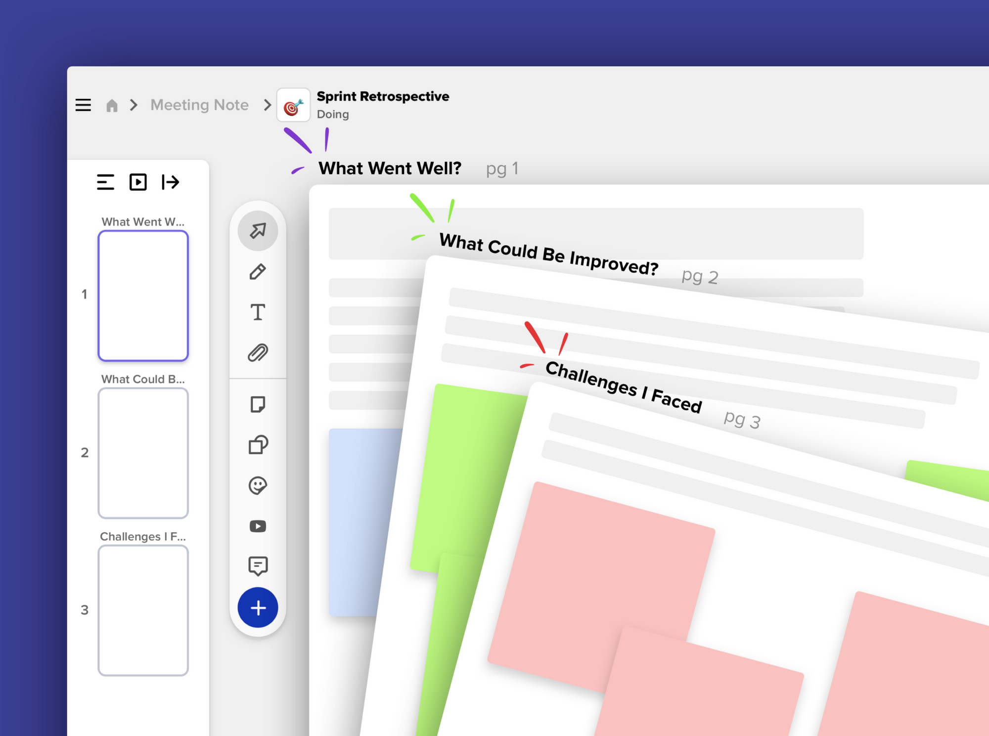 The retrospective canvas is special in the way it is organized: each discussion topic warrants its own page, and all pages are accessible to everyone. The clients are divided into different rotating groups, each group tackling a discussion topic. Once they are done with a topic, they can move on to the next one and see notes and ideas from previous groups. This way, everyone can focus on one topic at a time, while being able to go through the whole retrospective canvas without having to repeat feedback from others.