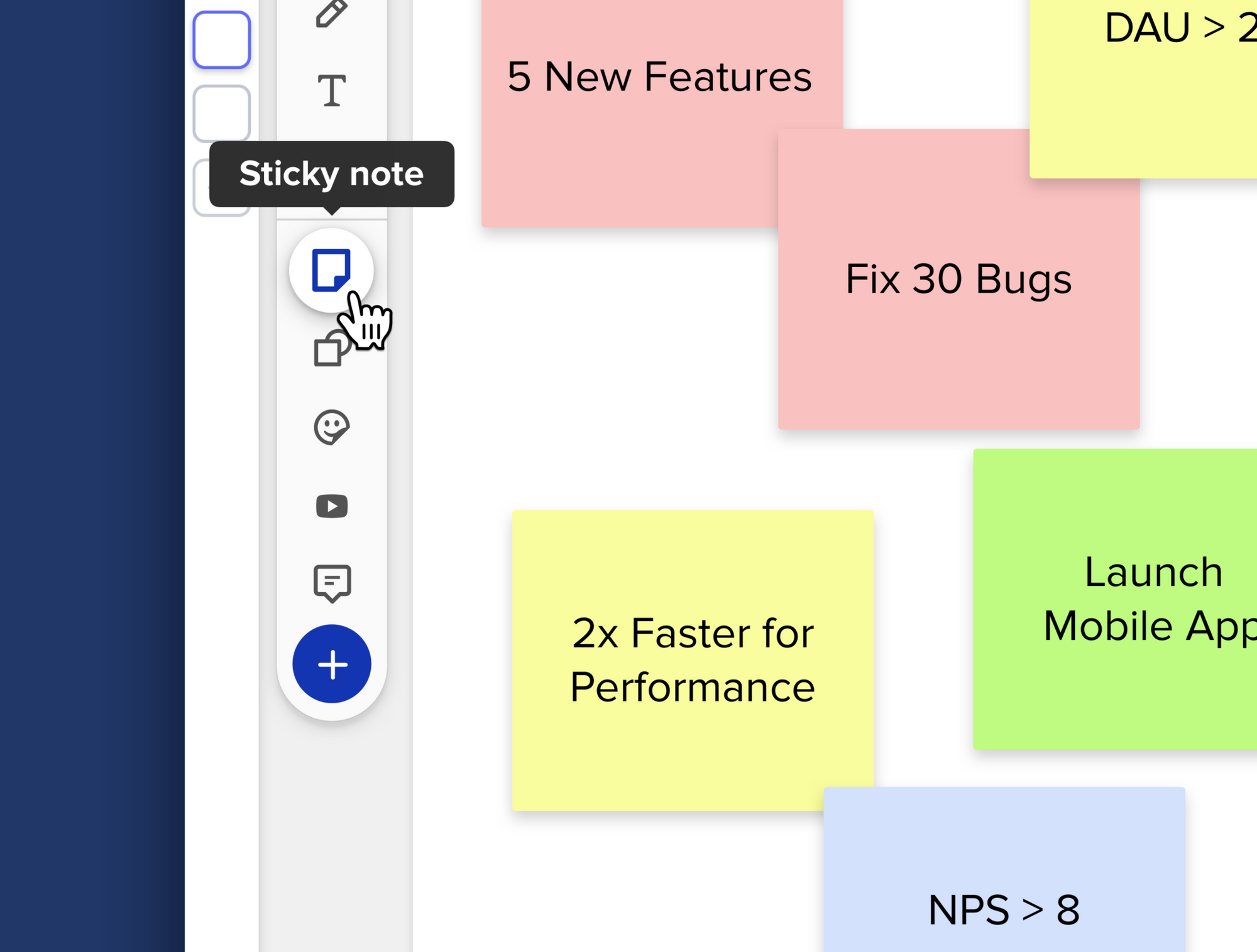 Jessica creates an OKR canvas before the meeting with the clients. Once the meeting starts, participants can easily pitch in their ideas through virtual sticky notes. Each person is assigned a color for their cursor and sticky notes, making it easy to identify who writes or modifies anything on the canvas.