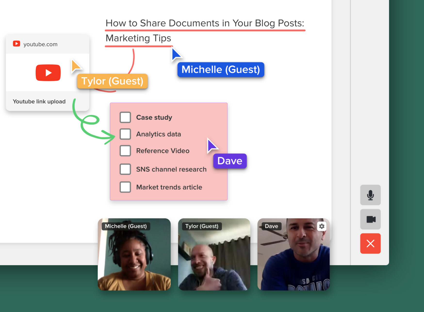 The canvas also offers video calls without any extra steps. All participants’ cursors are shown with their names, enabling easy identification.