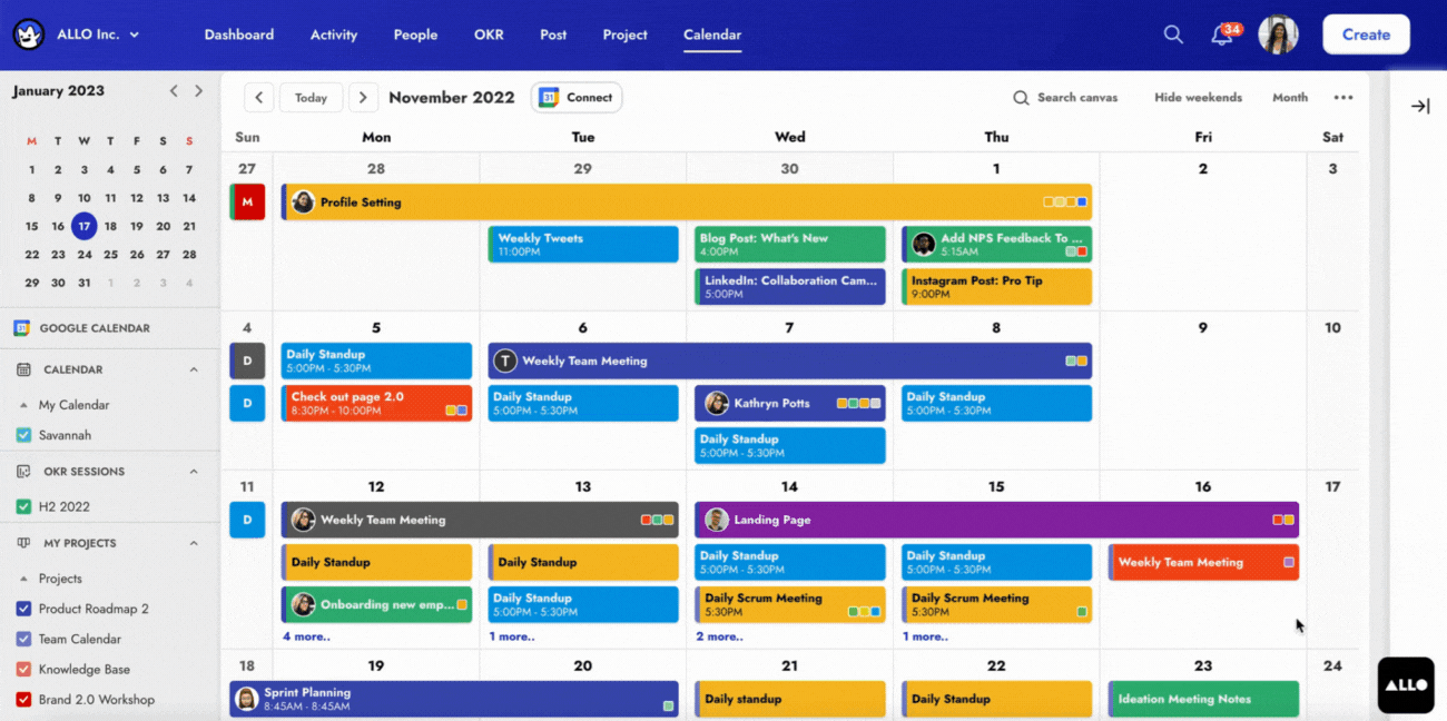 - My Dashboard: View your personal events and projects and prepare for your weekCalendar: Now, every event synced from your Google Calendar in Allo automatically generates a canvas. Store all your important meeting notes and documents directly in the event calendar.