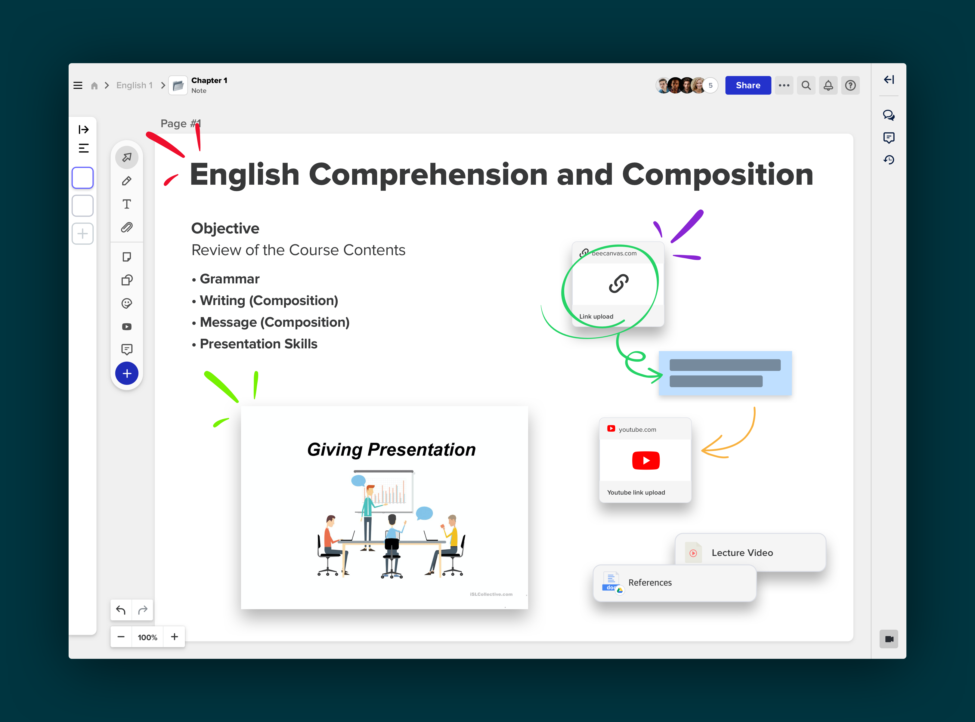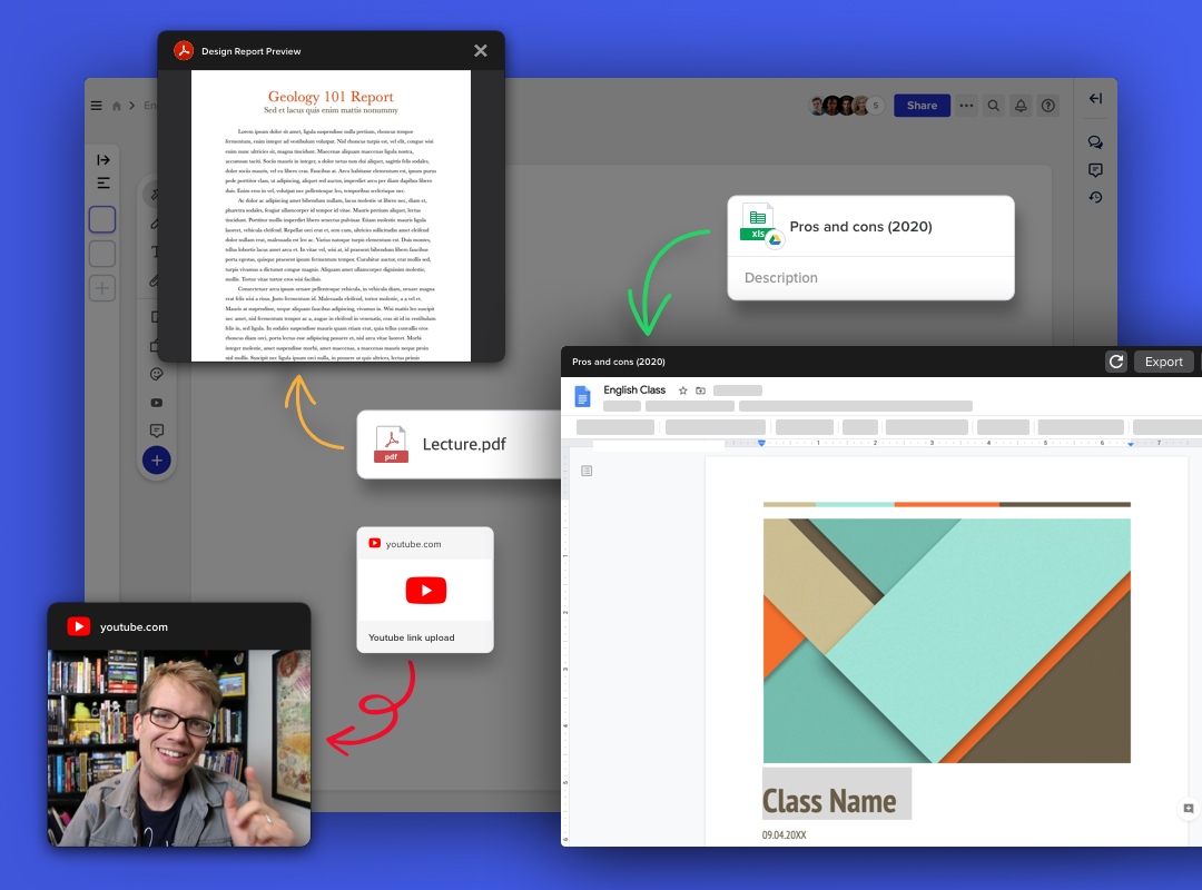 As mentioned earlier, Sami prefers adding in videos and images in the lectures as references. With Allo, YouTube videos, images, and many other types of files such as PDF, Google Docs, Photoshop, etc. can simply be dragged and dropped into the canvas. Not only can the files be previewed inside of Allo directly, Google Docs can also be edited and updated in real-time within Allo.