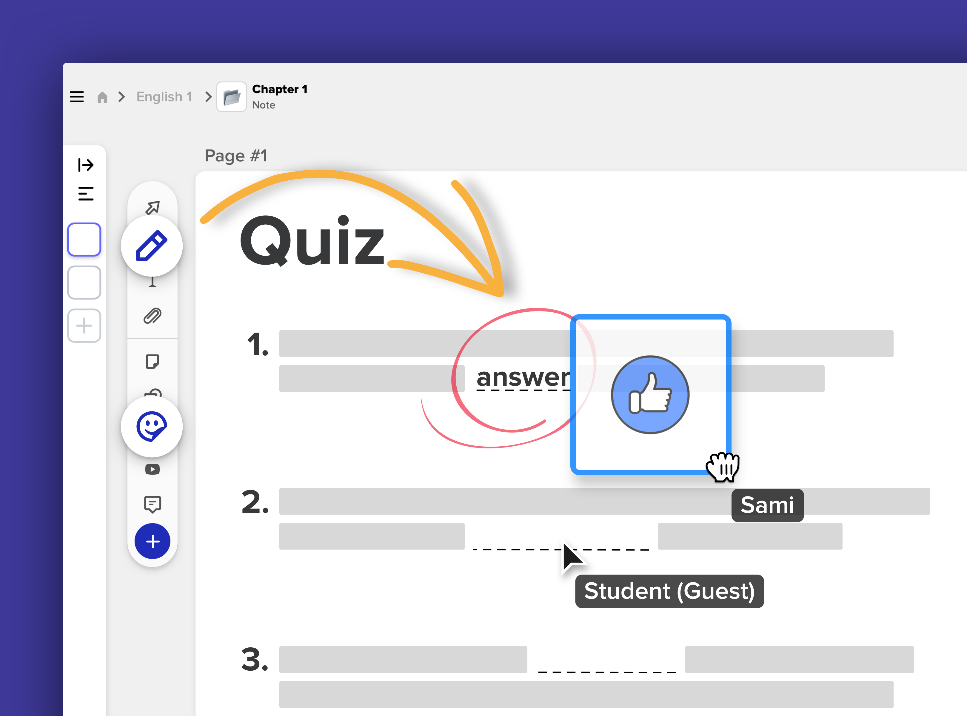 Sami and the student can collaborate at the same time on the canvas. While the student fills out the answers for the quiz, Sami can mark wrong answers using the pen tool, and make notations using stickers, shapes or sticky notes.