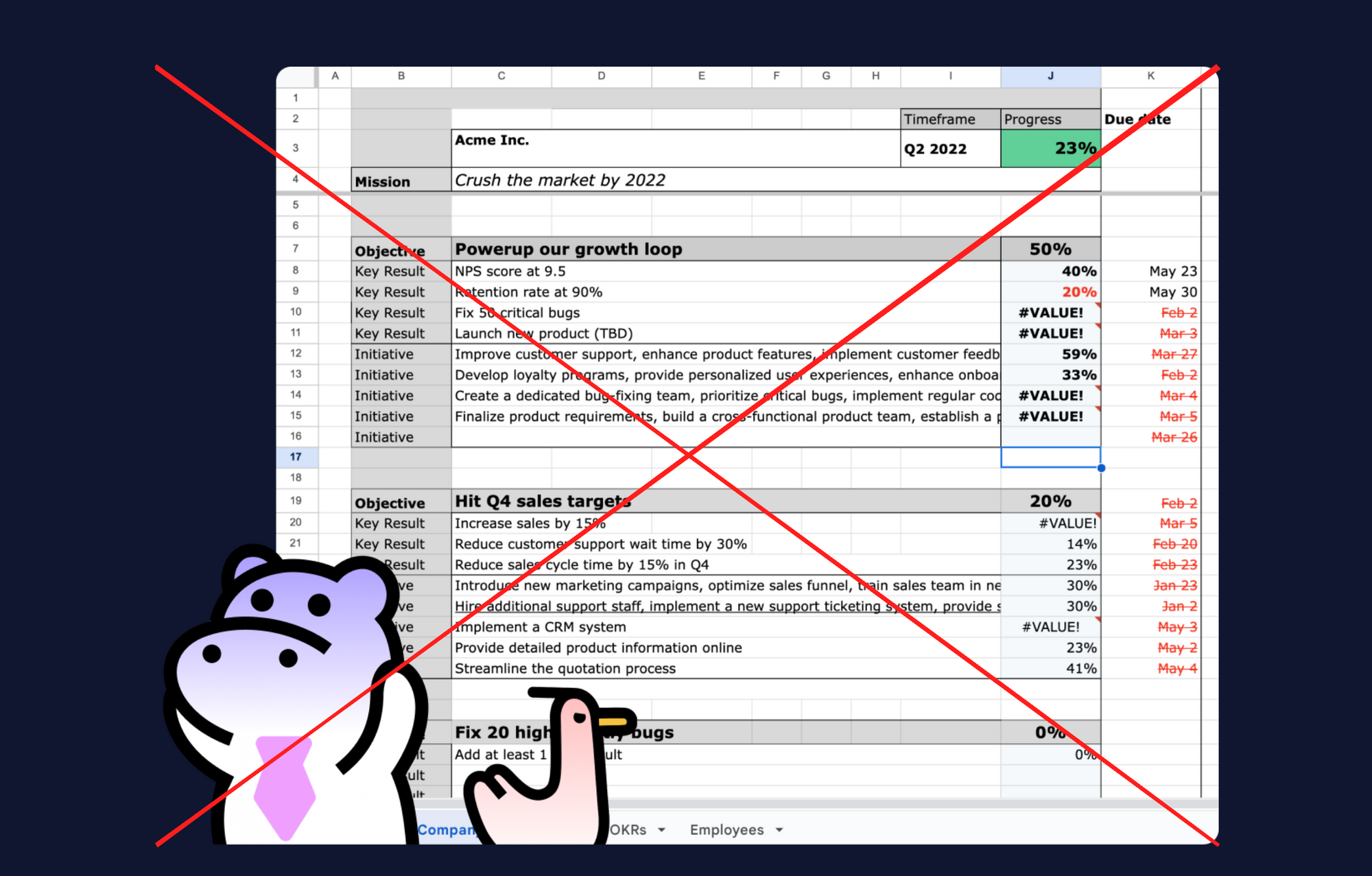 For example, a 50-page Google Sheet with OKRs for the year buried between sales projections, inventory data, and performance metrics quickly becomes ignored. Teams struggle to focus when OKRs are just another spreadsheet tab crammed with numbers and acronyms.