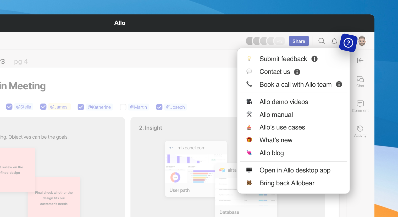 We know that for many of our users using a remote work software like Allo is a new experience, and often there are many questions that come up while exploring our unique visual documents. Because of this, over time have introduced the Allo helpers and written helpful articles like how to create visual documents All in an effort to making our platform easy to understand and more useful to you, our users. The same can be said for our improved help button. Now helpful resources are seconds away anytime in-app. We invite you to give it a try, and you can even tell us you like it (or don't š), using the submit feedback option. Your opinion on the platform matters and we are greatly inspired by your thoughtful feedback, empowering you to collaborate is why we made these resources and we are overjoyed to help you share, create and inspire with Allo.