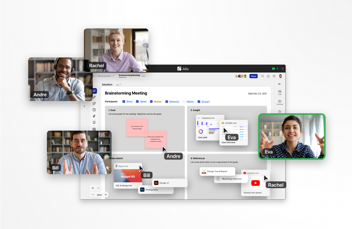 You can connect Allo with Zoom and have all members live on a video call while brainstorming with sticky notes, text, images, and doodles. Everyone from your virtual team can add their ideas and opinions to Allo’s whiteboard in real-time anywhere and using any device.