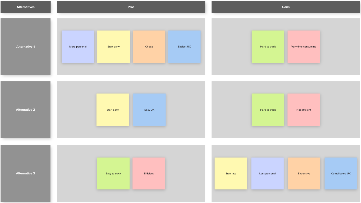 We often face the challenge of needing to decide on only one or two options when there are multiple of them. We may be familiar with the idea of analyzing the pros and cons of each alternative before making the decision. Instead of listing everything down only in words, present them with a more visual way such as using tables can help us see things more clearly and thoroughly. We can then analyze the strengths and weaknesses of each alternative a lot more easily and efficiently.
