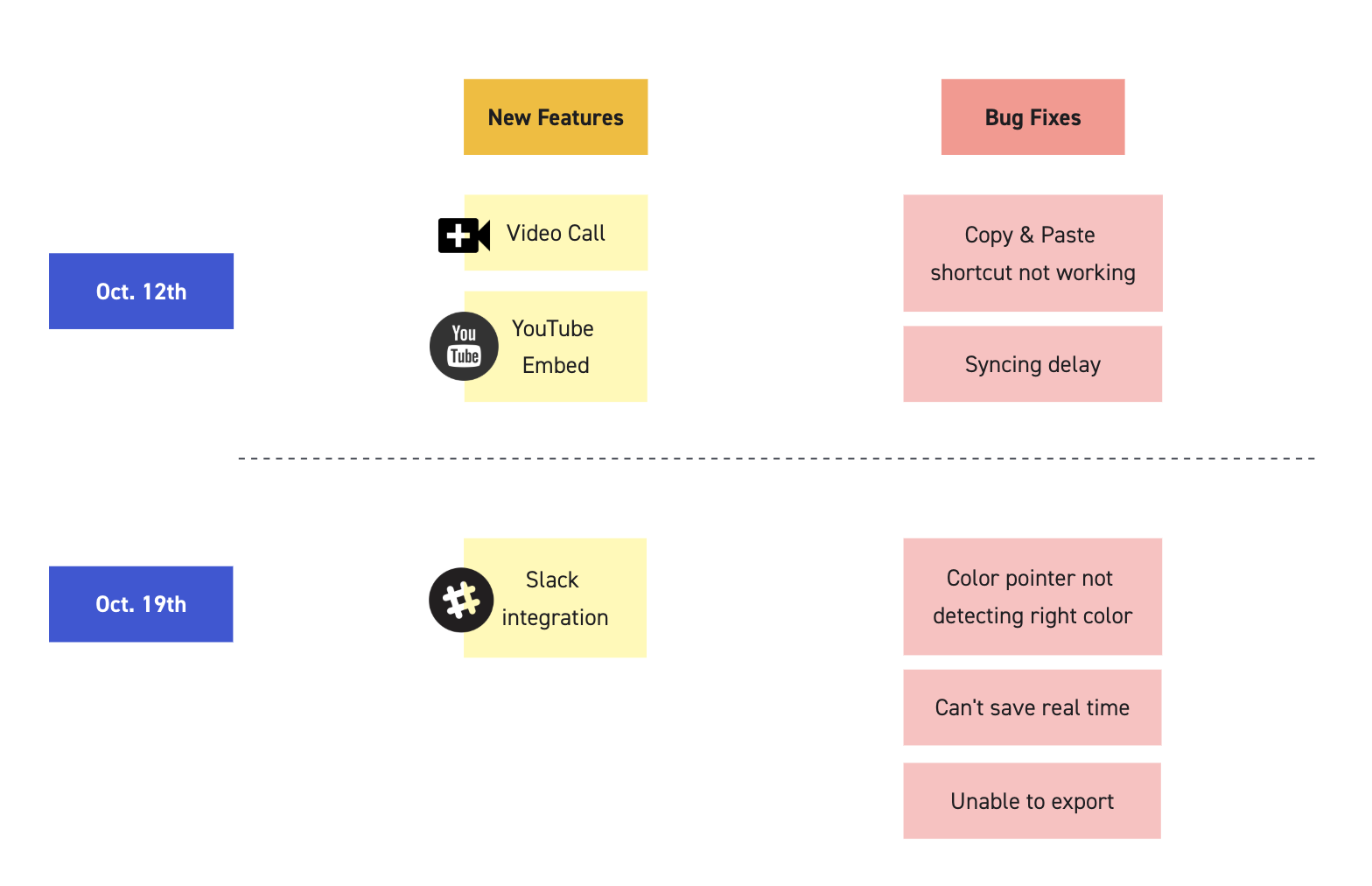 It is well known that visual stays in the memory faster and longer. When we deliver a message using visuals instead of pure texts, it helps our teams and ourselves to fully understand each other easier and faster. Let's imagine we are delivering the following statement to the whole team: "On the week of Oct. 12th, we will be releasing 2 new features of video call and YouTube embed, 2 bug fixes of copy & paste shortcut not working well and syncing delay. And on the week of Oct. 19th, we will be releasing 1 new feature of Slack integration and 3 bug fixes of color pointer not detecting the right color, can't save real-time, and unable to export". It would have been a lot easier if we simply present the visual below to the team instead: