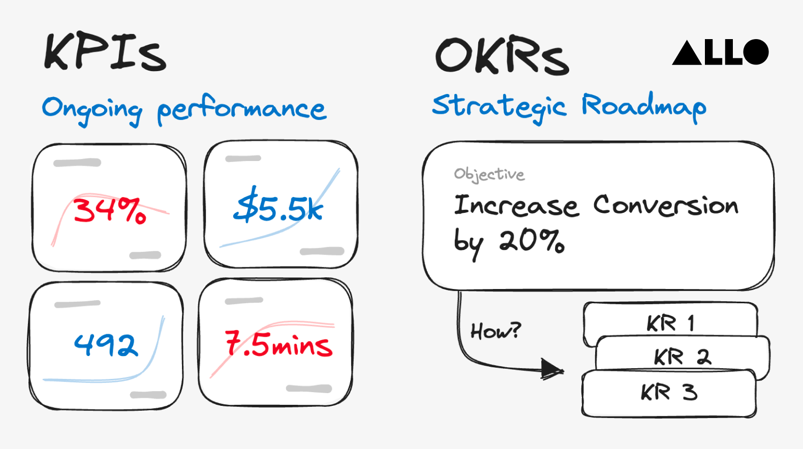 While KPIs track ongoing performance, OKRs aim to improve it.